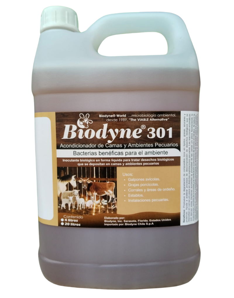 En el momento del despacho entre 1×10⁹ – 1×10⁸ Unidades Formadoras de Colonia (UFC)/ml y después de 1 año a temperatura ambiente 1×10⁸ – 1×10⁷ UFC/ml aproximadamente. Biodyne® 301 acondicionador de camas y ambientes pecuarios es un consorcio microbiano compuesto por bacterias y hongos benéficos, de origen natural, capaces de producir diferentes tipos de enzimas celulolíticas, proteolíticas, lipolíticas y amilolíticas principalmente. El vehículo es un nutriente líquido a base de proteínas de origen vegetal, azúcares y elementos minerales. Biodyne® Biodyne 301 Acondicionador de Camas y Ambientes Pecuarios es estrictamente un “caldo” de cultivo microbiano y por lo tanto no incorpora dentro de la formulación compuestos químicos de uso frecuente en productos de aseo y limpieza como tensoactivos, fragancias y colorantes. Ningún organismo presente en el producto ha sido modificado genéticamente.