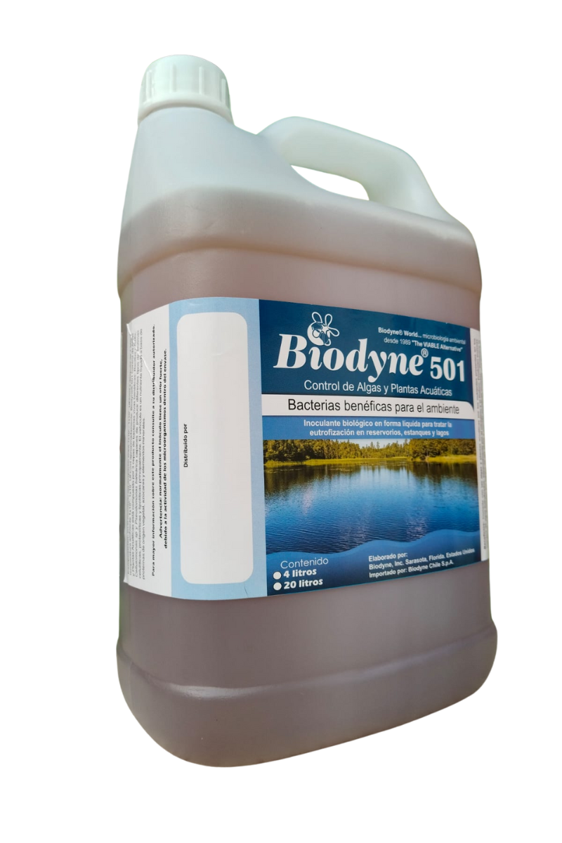Biodyne® 501 Control de Algas y Plantas Acuáticas es un consorcio microbiano desarrollado por Biodyne Inc, Sarasota, FL, USA, hace más de 20 años, específicamente para controlar la sobrepoblación de algas y plantas acuáticas en cuerpos de agua con eutrofización. El producto está formulado con bacterias y hongos que compiten por los nutrientes con las algas y las plantas acuáticas, desincentivando su crecimiento y sobrepoblación.