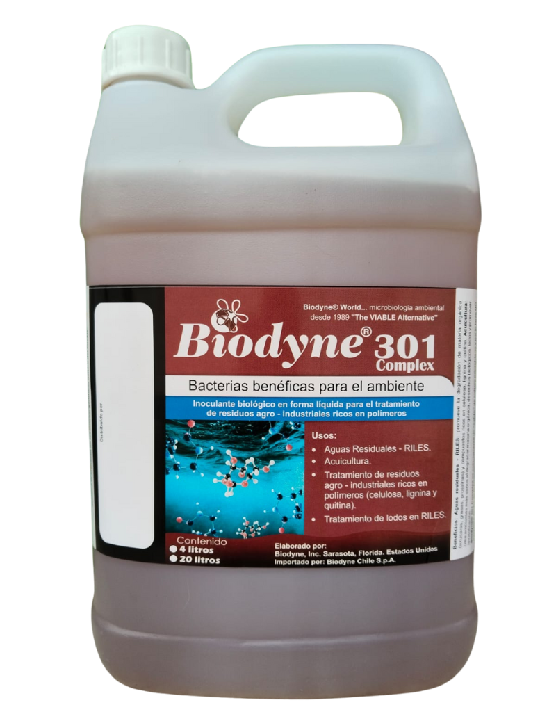 En el momento del despacho entre 1×10⁹ – 1×10⁸ Unidades Formadoras de Colonia (UFC)/ml y después de 1 año a temperatura ambiente 1×10⁸ – 1×10⁷ UFC/ml aproximadamente. Biodyne® 301 Complex está compuesto por 30 cepas de bacterias vivas benéficas (algunas facultativas) y hongos que producen proteasas, amilasas, esterasas, lipasas, fosfatasas, ligninasas, celulasas, quitinasas y ureasas. Este consorcio microbiano es muy efectivo degradando materiales ricos en polímeros: celulosa, lignina y quitina. El vehículo es un nutriente líquido a base de proteínas de origen vegetal, azúcares y elementos minerales. Biodyne® 301 Complex es estrictamente un “caldo” de cultivo microbiano y por lo tanto no incorpora dentro de la formulación compuestos químicos de uso frecuente en productos de aseo y limpieza como tensoactivos, fragancias y colorantes. Ningún organismo presente en el producto ha sido modificado genéticamente.